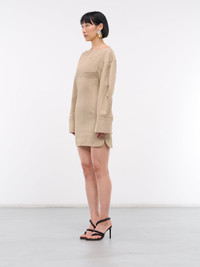 JACQUEMUS dress in beige, poly-wool blend, paneled twill construction, boat neck, long sleeves, double-button barrel cuffs, chest patch pocket, back cut-out, back waist adjustable belt, side slits, straight hem, mini length, relaxed fit. Made in Bulgaria 55% Polyester 45% Virgin Wool French Sizing Model is 5'9" wearing size 36. Bust: 30" Waist: 23" Hips: 35"