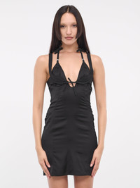JACQUEMUS black dress, integrated harness, beaded fringe detailing, adjustable buckled halter neck, side lingerie button fastening, concealed side zip closure, curved seams, mini length, fitted. Made in Portugal Body - 96% Viscose, 4% Elastane Lining - 49% Cotton, 46% Acetate, 5% Elastane Italian Sizing Model is 5'8" wearing size 36. Bust: 32" Waist: 26" Hips: 34.5"