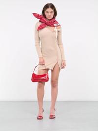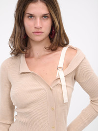 JACQUEMUS beige dress, off-shoulder cardigan design, rib knit, asymmetric pointed collar, button closure, & strap, D-ring adjuster, long sleeves, mini length, fitted. Made in Romania 82% Wool, 17% Polyamide, 1% Elastane Italian Sizing Model is 5'9" wearing size 36. Bust: 32" Waist: 24" Hips: 34"
