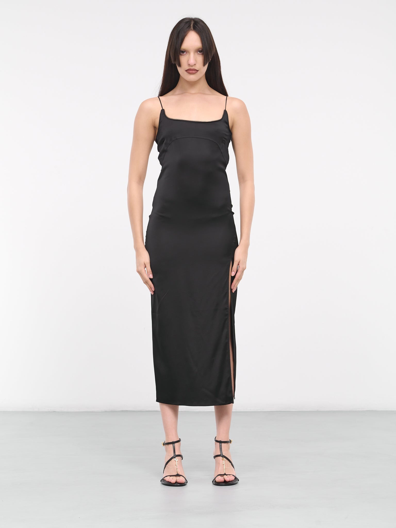 JACQUEMUS dress in black, paneled stretch satin construction, scalloped neckline, spaghetti straps, sleeveless, armscyes, back metal logo plaque, side concealed zip closure, side slit, straight hem, maxi-length, slim fit. Made in Bulgaria 96% Viscose 4% Elastane French Sizing Model is 5'8" wearing size 34. Bust: 32" Waist: 26" Hips: 34.5"