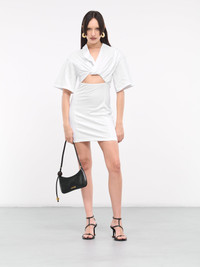 JACQUEMUS dress in white, twisted t-shirt dress design, paneled cotton construction, twisted rib neckline, dropped shoulders, short sleeves, waist cut-outs, back lingerie strap detailing, back concealed zip closure, straight hem, mini-length, boxy & slim fit. Made in Portugal 100% Cotton Standard Sizing Model is 5'8" wearing size S. Bust: 32" Waist: 26" Hips: 34.5"