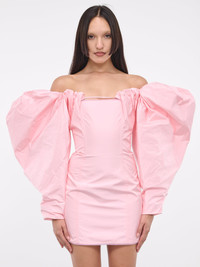 JACQUEMUS pink dress, draped design, strapless, puffed long sleeves, concealed back zip closure, mini length, fitted. Made in Portugal Body - 100% Polyester Lining - 97% Cotton, 3% Elastane French Sizing Model is 5'8" wearing size 34. Bust: 32" Waist: 26" Hips: 34.5"