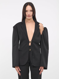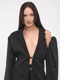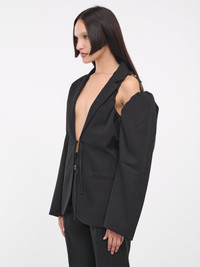 JACQUEMUS black jacket, asymmetric design, notched lapel collar, exposed shoulder, single puffed sleeve, metal D-ring fastening, welt pockets, gold-tone hardware, fully lined, tailored fit. Made in France Body - 60% Linen, 26% Viscose, 14% Polyester Lining - 49% Cotton, 46% Acetate, 5% Elastane French Sizing Model is 5'8" wearing size 36. Bust: 32" Waist: 26" Hips: 34.5"