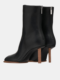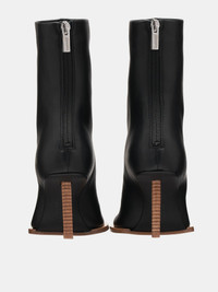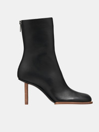 JACQUEMUS boots in black, asymmetric geometric boot design, ankle length, square & round toe, footprint cushioned padding, logo embossed insole, back zip closure, silver-toned hardware, leather lining, leather wrapped heel, rubber sole. Made in Italy 100% Lamskin European Sizing 3" Heels