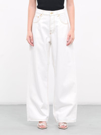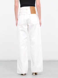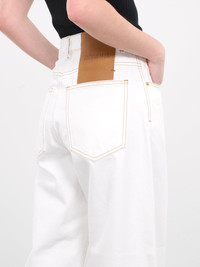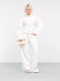 JACQUEMUS pants in white, paneled denim construction, high-waisted, belt loops, back logo patch, front button & concealed zip fly closure, inset pockets, coin pocket, back patch pockets, wide leg, loose fit. Made in Italy 100% Cotton Standard Sizing Model is 5'9" wearing size 26. Bust: 32" Waist: 24" Hips: 34"