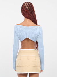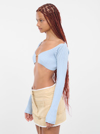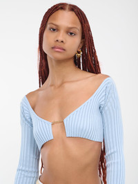 JACQUEMUS blue top, cardigan design, micro charm logo, rib knit, scoop neck, elongated sleeves, micro length, slim fit. Made in Portugal 81% Viscose, 12% Nylon, 4% Elastane, 3% Polyester French Sizing Model is 5'8" wearing size 32. Bust: 32" Waist: 24" Hips: 34