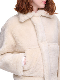 JACQUEMUS jacket in off-white, leather washed shearling, foldable collar, hidden zip closure with snap button tab, kangaroo pockets, zipped sleeves, round oversized fit. "Le Papier", inspired by the earthy tones coloring the Salt Marshes of Aigues-Mortes. Minimal, modern & classic. Made in France French Sizing Composition: 100% Lambskin Model is 5'7" and is wearing size 32. Bust: 32" Waist: 25" Hip: 37"