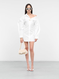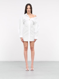 JACQUEMUS dress in white, shirt dress design, paneled cotton poplin construction, off-shoulder, pointed collar, adjustable shoulder strap, dropped shoulders, long sleeves, front concealed buttoned placket closure, engraved mother-of-pearl buttons, asymmetric chest pocket, integrated waist belt, adjustable buckle, gold-tone hardware, straight hem, mini-length, oversized fit. Made in Bulgaria 100% Cotton French Sizing Model is 5'8" wearing size 34. Bust: 32" Waist: 26" Hips: 34.5"