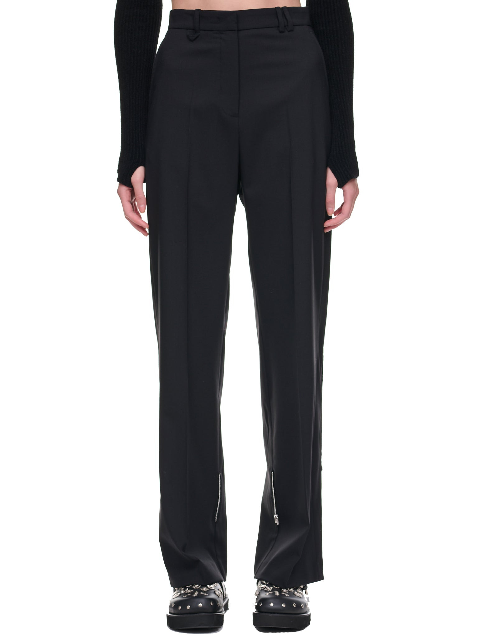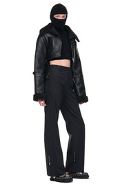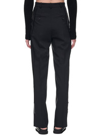 JACQUEMUS trousers in black, stitched suit design, mid-high waist, long flared legs, contrast stitching, branded double belt loops, hook & button zip fastening, stitched pleats, side pockets, back buttoned welt pockets, straight cut, tailored fit. "Le Papier", inspired by the earthy tones coloring the Salt Marshes of Aigues-Mortes. Minimal, modern, classic, & sexy. Made in Romania French Sizing 60% Linen, 26% Viscose, 14% Polyester Model is 5'9" wearing size 36. Bust: 33" Waist: 24" Hip: 33"