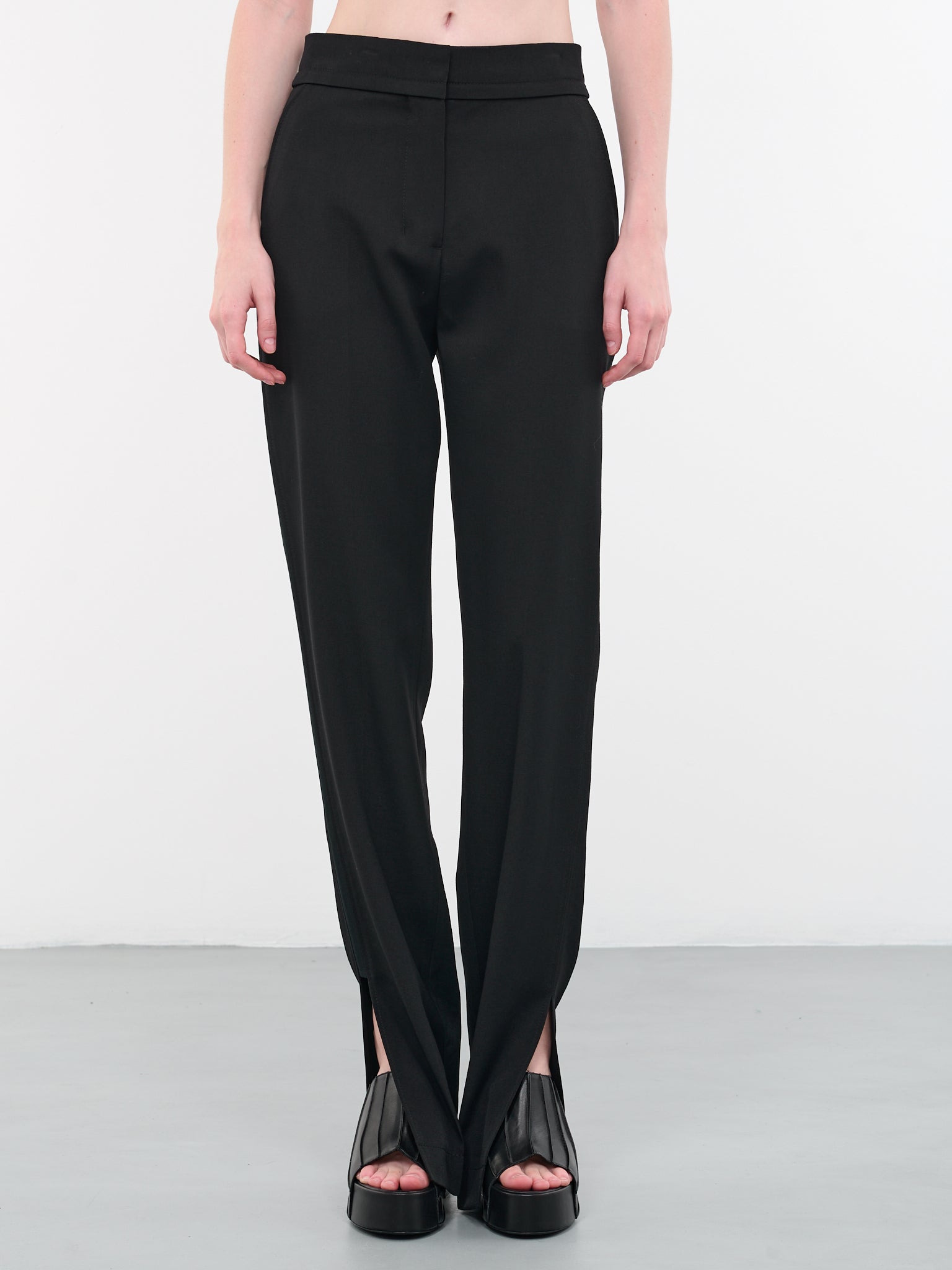 JACQUEMUS trousers in black, wool suiting fabric, high-waist, concealed hook button & zip fastening, side seam & back welt pockets, right side ribbon insert, loose pleats, tapered leg, slit hem, full length, tailored fit. Made in Romania Italian Sizing 100% Virgin Wool Model is 5'10" wearing size 36. Bust: 32" Waist: 24" Hips: 35"