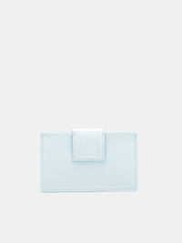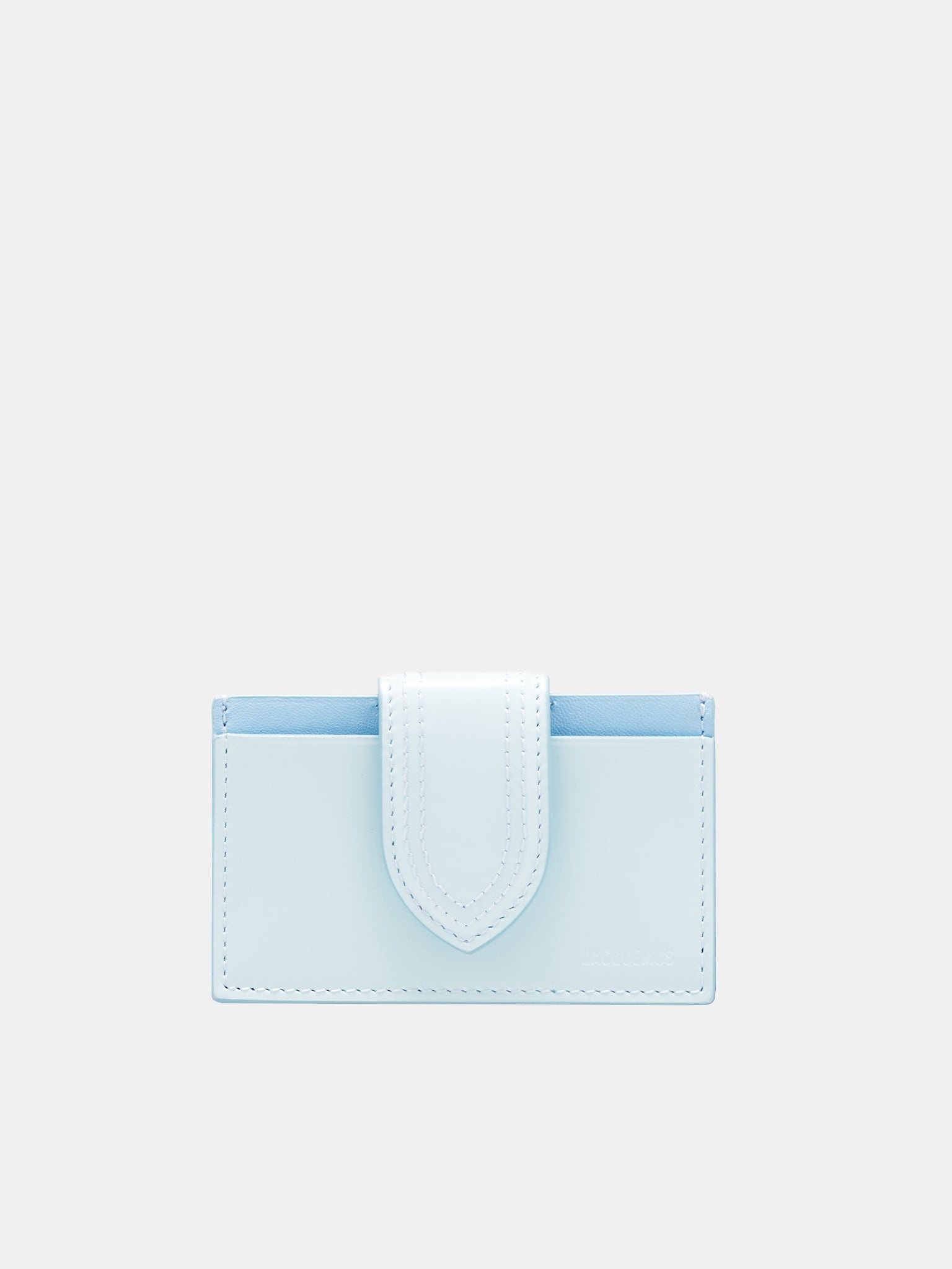JACQUEMUS light blue wallet, coin purse design, genuine leather, magnetic flap closure, card slots, embossed logo. Made in Italy 100% Cow & Lamb Leather 3.9" x 2.4"