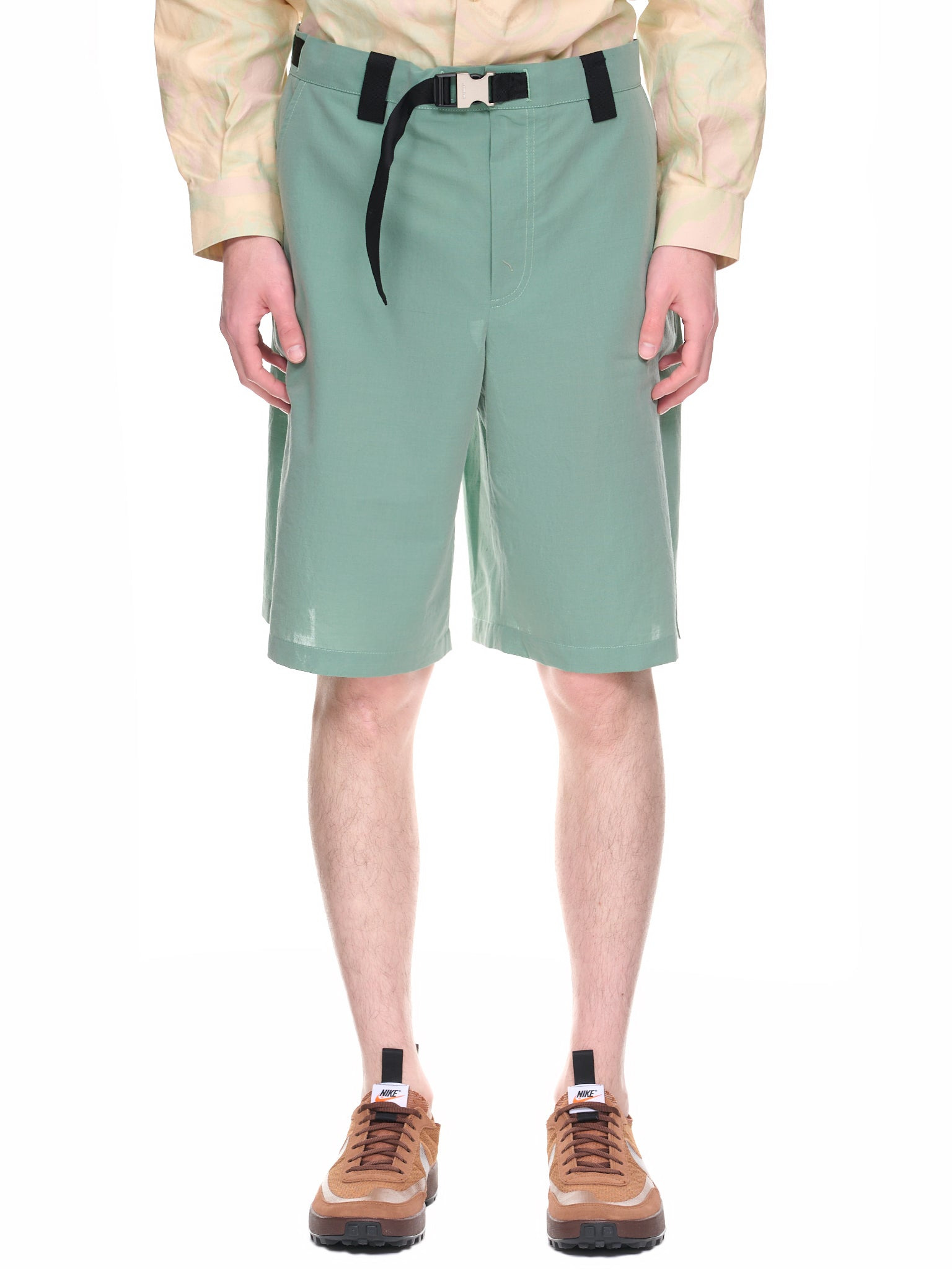 JACQUEMUS shorts in green, viscose linen blend, high-rise, belt loops, integrated press-release belt, button zip-fly, three-pockets, engraved silver-toned hardware, regular length & fit. Made in Lithuania European Sizing 64% Viscose, 36% Linen Model is 6'3" wearing size 50. Shoulders: 19" Chest: 35" Waist: 32"