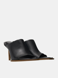 JACQUEMUS shoes in black, asymmetric geometric mule design, open square & round toe, insole embossed logo, footprint cushioned padding, leather lining, rubber sole, plastic round, square toe cap, leather wrapped heel. Made in Italy European Sizing 100% Lamskin 3" Heels