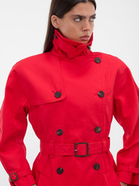 Red fitted trench coat in water-repellent cotton gabardine with a cropped silhouette and contrast crocodile-embossed horn buttons. Featuring: • Cropped fit • Wide convertible lapel with buttoned throat latch • Double-breasted closure • Adjustable belt with belt loops • Square horn buckles • Wide trench pockets • Cropped sleeves with wrist straps • Back yoke with “J” loop • Topstitched details • Buttoned back slit • Contrast crocodile-embossed horn buttons • Made in Bulgaria • Main: 90% Cotton 10% Polyurethane | Lining: 55% Cotton 45% Polyester • French sizing Model is 5'8" wearing size 36. Bust: 32.5" Waist: 24" Hips: 34"