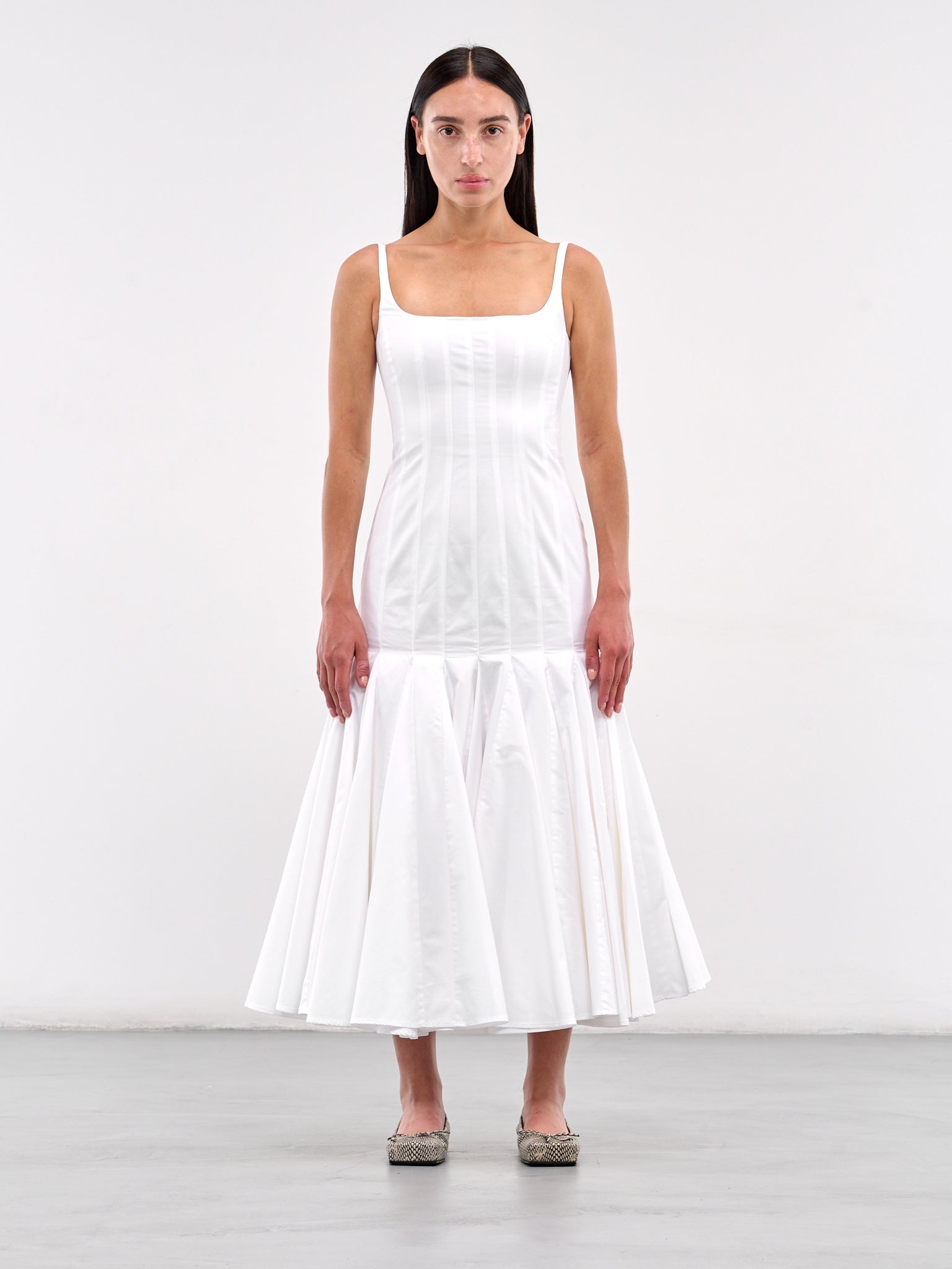 JACQUEMUS dress in white, paneled cotton construction, square neckline, shoulder straps, sleeveless, armscyes, back concealed zip closure, stitched pleating, flared skirt, tulle lining, midi-length, slim fit. Made in Bulgaria Outer: 100% Cotton Inner: 55% Cotton 45% Polyester French Sizing Model is 5'6" wearing size 36. Bust: 31" Waist: 24" Hips: 34"