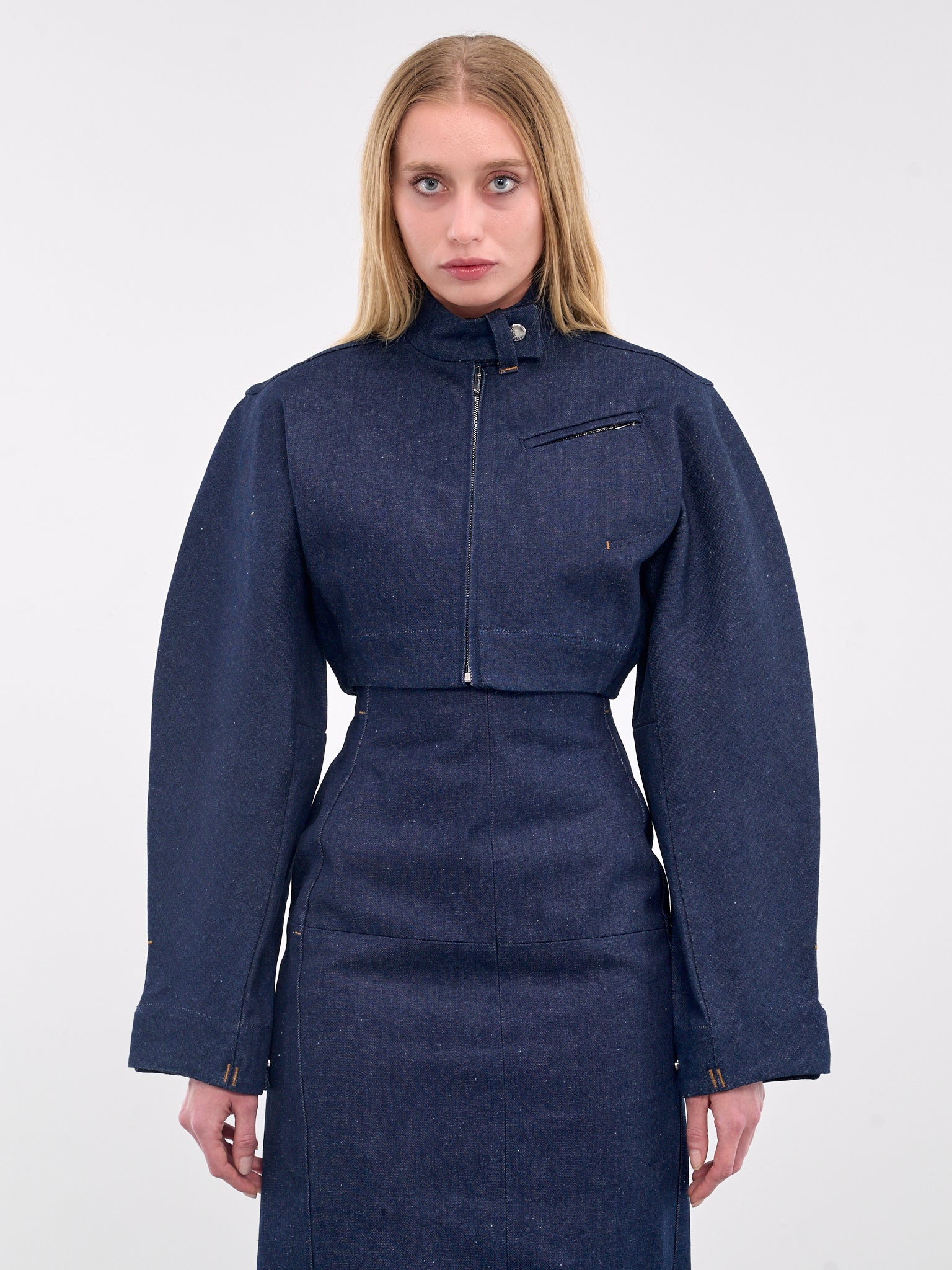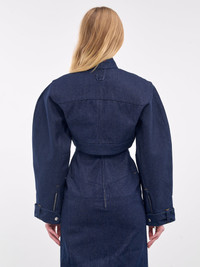 JACQUEMUS jacket in navy, paneled denim construction, stand collar, button fastening, front concealed zip closure, back J loop, long sleeves, cuff zip vents, loops & button straps, chest zip pocket, straight hem, cropped length, oversized fit. Made in Italy 100% Cotton French Sizing Model is 5'8" wearing size 34. Bust: 31" Waist: 23.5" Hips: 34"