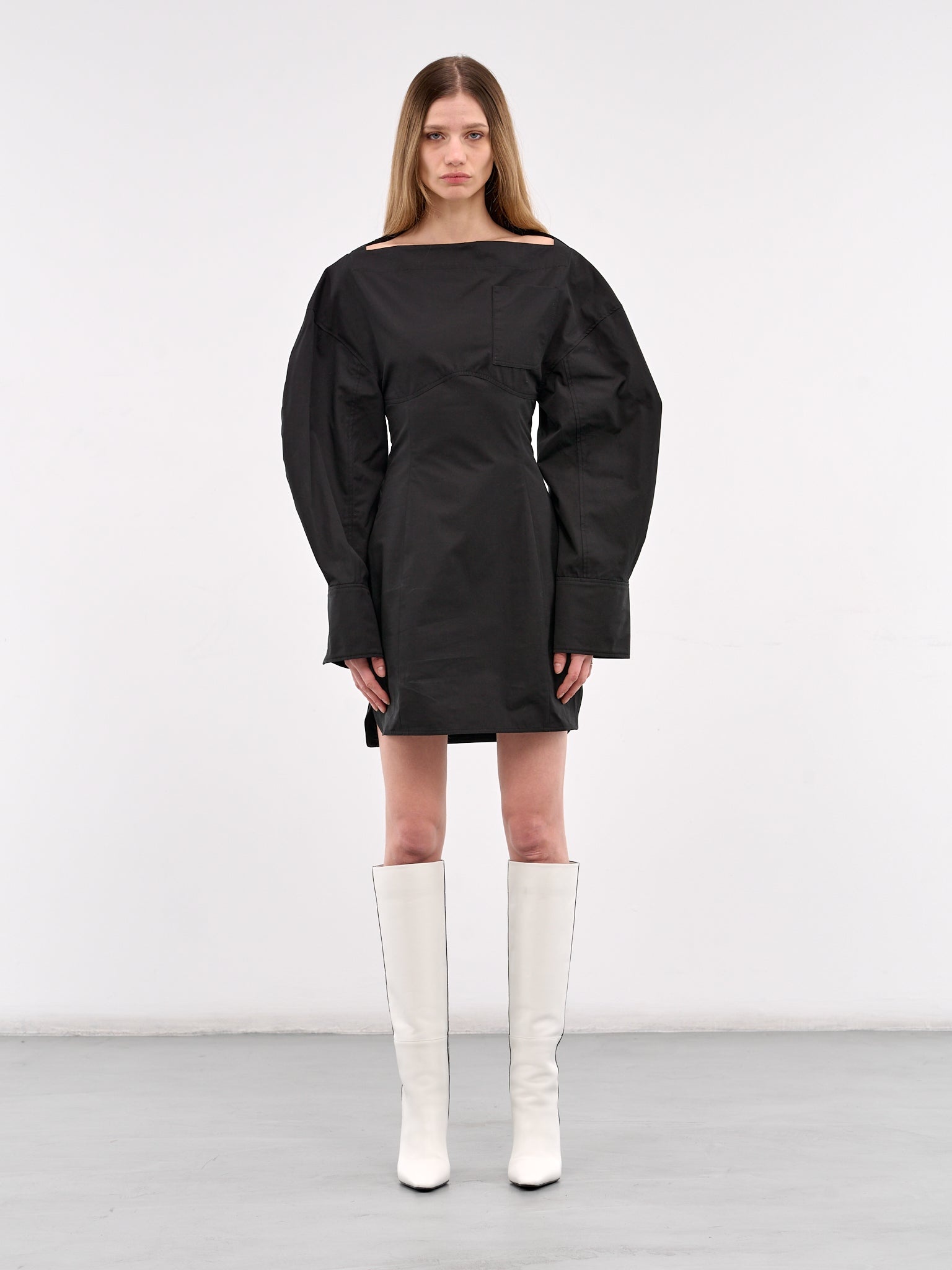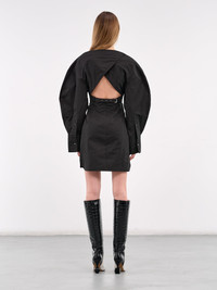 JACQUEMUS dress in black, paneled cotton construction, wide neck, oversized sleeves, button cuffs, front patch pocket, back cut-out, back adjustable pin-buckle belt, side slit, straight hem, mini-length, relaxed fit. Made in Bulgaria 100% Cotton French Sizing Model is 5'9" wearing size 34. Bust: 32" Waist: 23" Hips: 34"