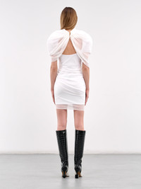 JACQUEMUS dress in white, paneled polyester construction, sheer chiffon overlay, draping throughout, rounded neck, back clasp closure, front cut-out, open back, draped sleeves & layered short sleeves, angled hem, lined, mini-length, slim fit. Made in Italy Outer: 100% Polyester Inner: 97% Cotton 3% Elastane French Sizing Model is 5'9" wearing size 34. Bust: 32" Waist: 23" Hips: 34"