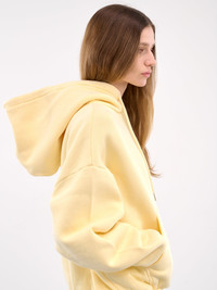 JACQUEMUS hoodie in yellow, paneled cotton construction, hood, adjustable drawstring, dropped shoulders, long sleeves, rib-knit cuffs & hem, chest logo embroidery, front kangaroo pocket, straight hem, oversized fit. Made in Portugal 100% Cotton Standard Sizing Model is 5'9" wearing size S. Bust: 32" Waist: 23" Hips: 34"