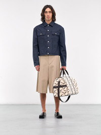 JACQUEMUS jacket in navy, paneled denim construction, spread collar, front button placket closure, long sleeves, buttoned cuffs, chest buttoned flap pockets, hem adjustable straps, straight hem, regular fit. Made in Portugal 100% Cotton European Sizing Model is 6'2" wearing size 48. Shoulders: 19" Chest: 38" Waist: 30"