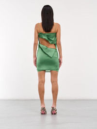 JACQUEMUS dress in green, paneled stretch viscose construction, straight neckline, spaghetti straps, sleeveless, armscyes, side button fastening, asymmetric back opening, straight hem, Muslin lining, mini-length, slim fit. Made in Romania Outer: 96% Viscose 4% Elastane Inner: 100% Polyester French Sizing Model is 5'6" wearing size 34. Bust: 31" Waist: 24" Hips: 34"