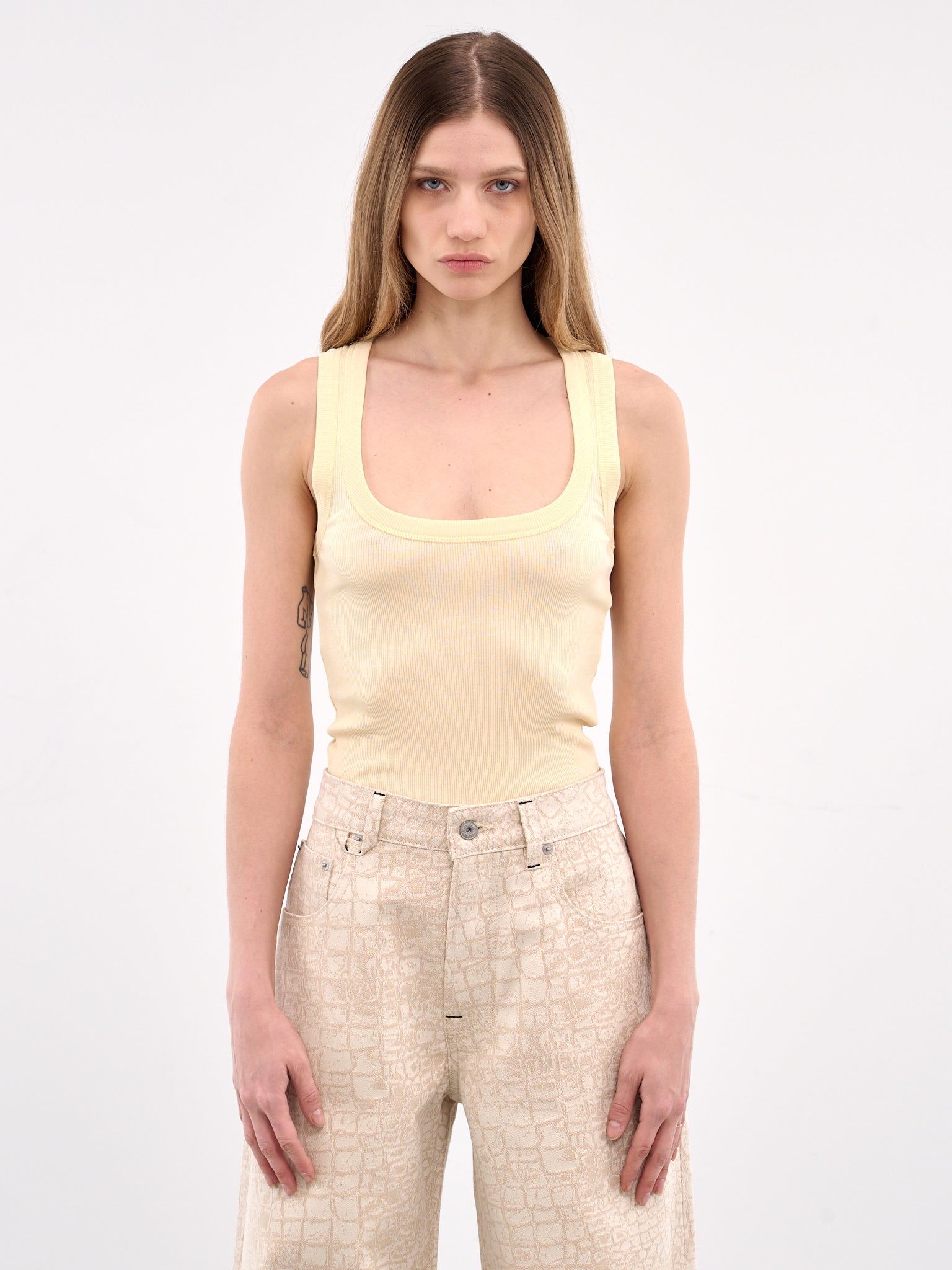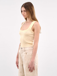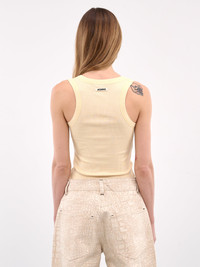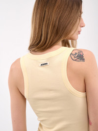 JACQUEMUS bodysuit in beige, paneled cotton construction, rib-knit, scoop neck, shoulder straps, sleeveless, armscyes, racerback, back grosgrain logo patch, high-cut, form fit. Made in Portugal 100% Cotton Standard Sizing Model is 5'9" wearing size S. Bust: 32" Waist: 23" Hips: 34"
