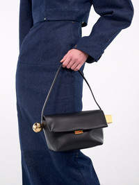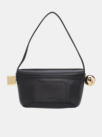JACQUEMUS bag in black, lambskin construction, shoulder strap, folded flap closure, gold-plated signature cube & sphere hardware, magnetic closure, back patch pocket, interior patch & zip pockets, gold-plated logo, lined. Made in Italy Outer: 100% Lambskin Inner: 100% Cotton One Size