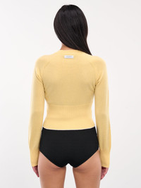 JACQUEMUS sweater in light yellow, paneled cashmere knit construction, crewneck, raglan long sleeves, rib-knit cuffs & hem, back logo tag, straight hem, slim fit. Made in Romania 96% Cashmere 4% Polyamide French Sizing Model is 5'6" wearing size 34. Bust: 31" Waist: 24" Hips: 34"