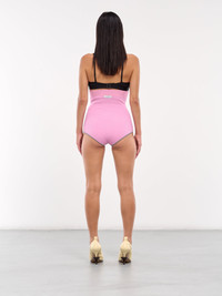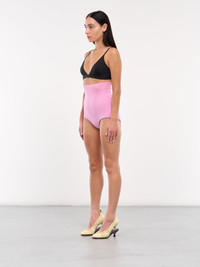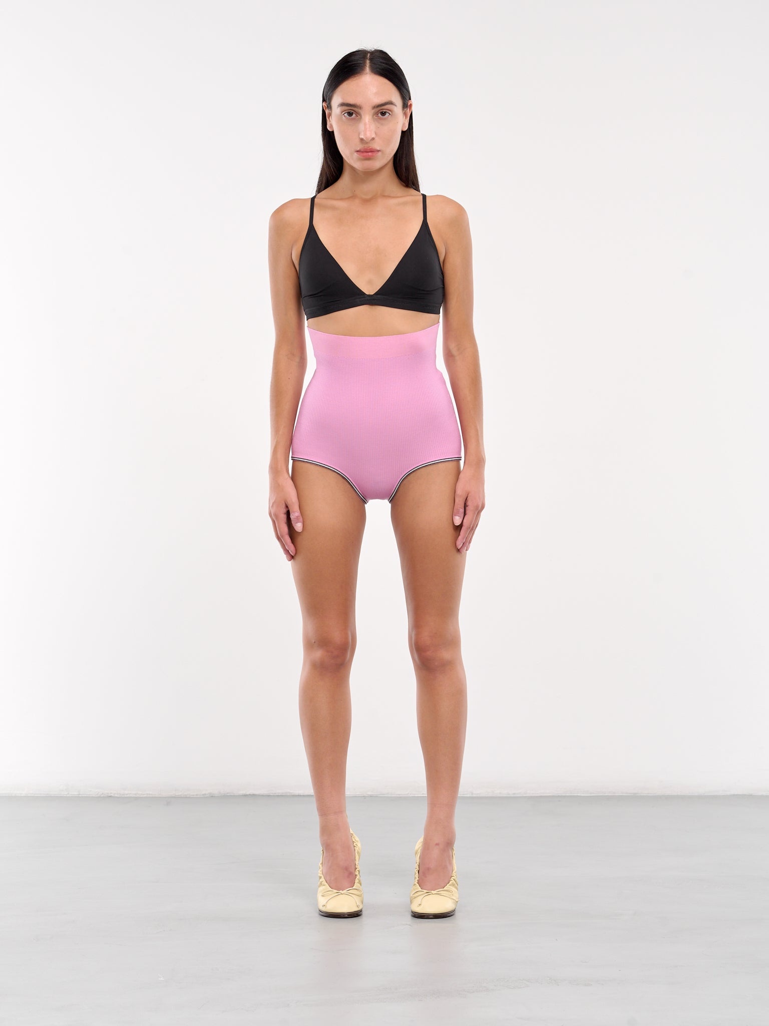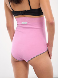 JACQUEMUS shorts in pink, wool-nylon blend, paneled knit construction, rib-knit, ultra high-waist, contrast stripe knit, back logo tag, micro-length, slim fit. Made in Romania 81% Wool 19% Nylon French Sizing Model is 5'6" wearing size 34. Bust: 31" Waist: 24" Hips: 34"