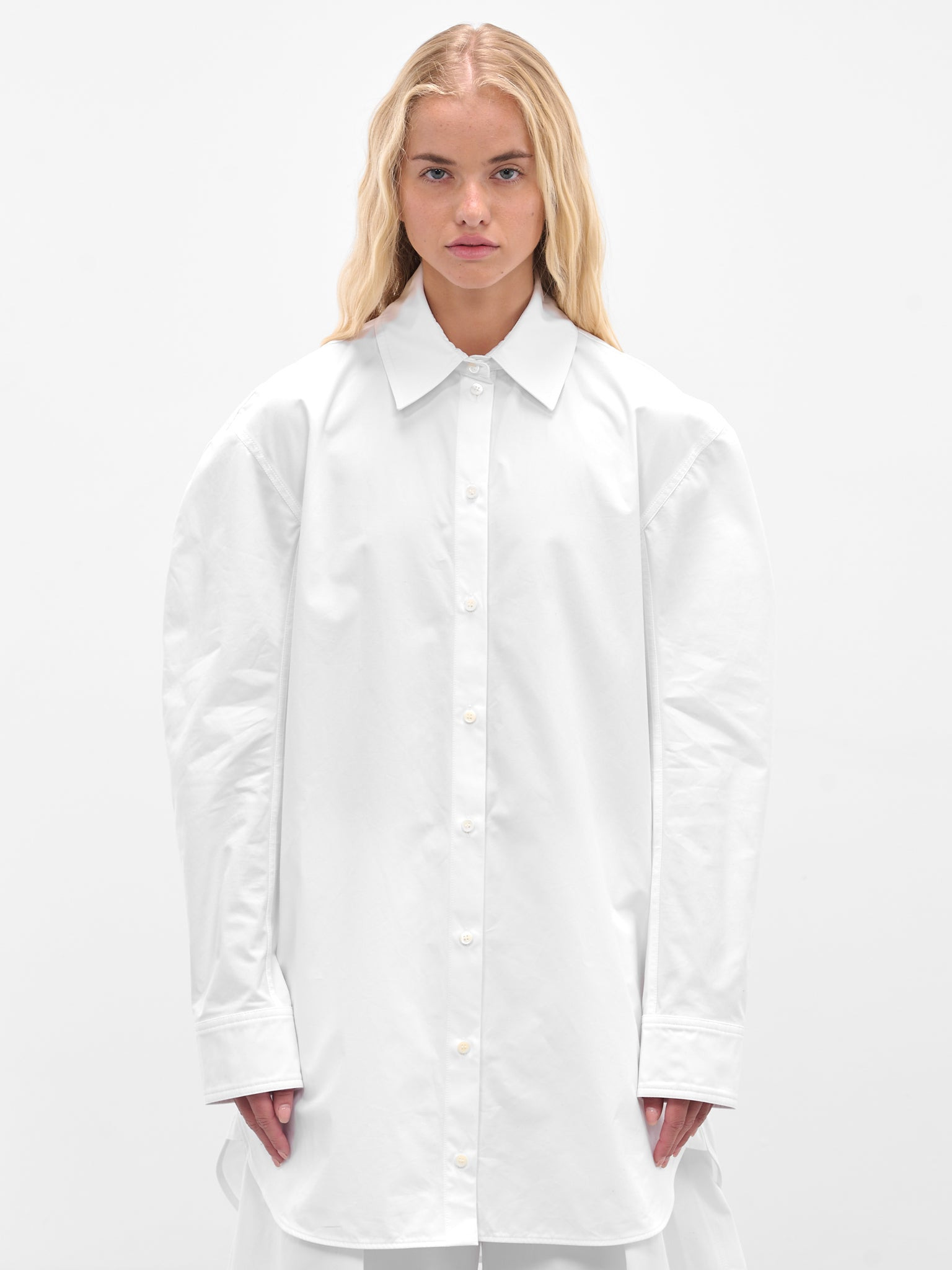 This oversized white shirt dress is crafted from crisp cotton poplin for a structured feel. The design plays with proportion, featuring sculpted, rounded sleeves for a distinctive silhouette. Featuring: • Oversized fit • Pointed collar • Rounded sleeves with pleated cuffs • Back yoke with pleat • Asymmetrical rounded hem • Mother-of-pearl buttons • Made in Bulgaria • 100% Cotton • French sizing Model is 5'8.5" wearing size 36. Bust: 32" Waist: 24" Hips: 34"