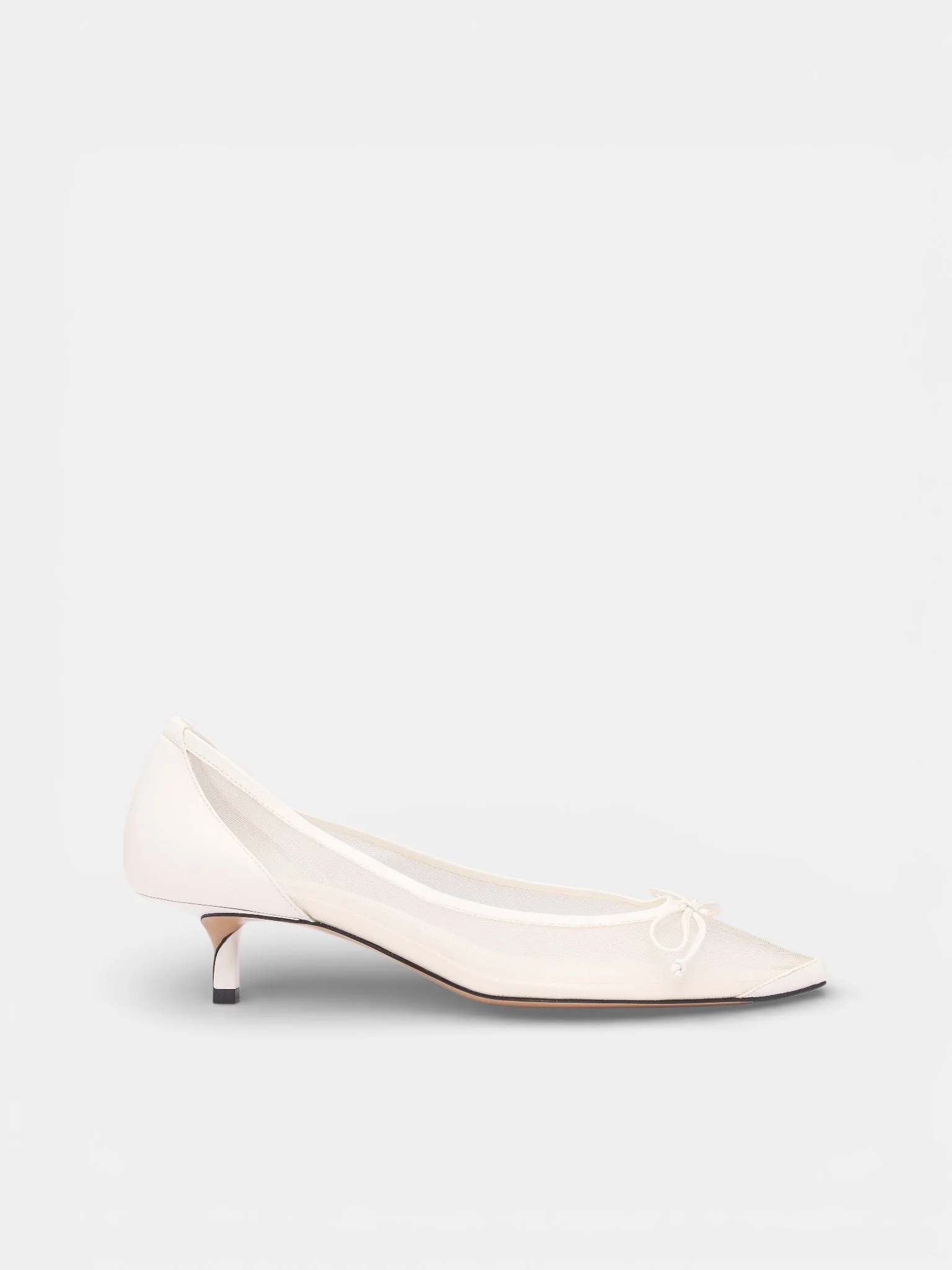Low twisted pumps constructed from transparent mesh with a pointed toe and sculptural asymmetric heel. Featuring: • Transparent mesh upper • Pointed toe • Small fixed bow • Stitched edge detailing • Signature "Rond-Carre" heel pads • Asymmetric twisted heel with lacquered finish • Contrast outsole • Kitten heel (heel height 4.5cm) • Made in Italy • Upper: 100% Polyamide | Insole: 100% Lambskin Leather | Lining: 100% Lambskin Leather | Outsole: 100% Cow Leather • Italian sizing