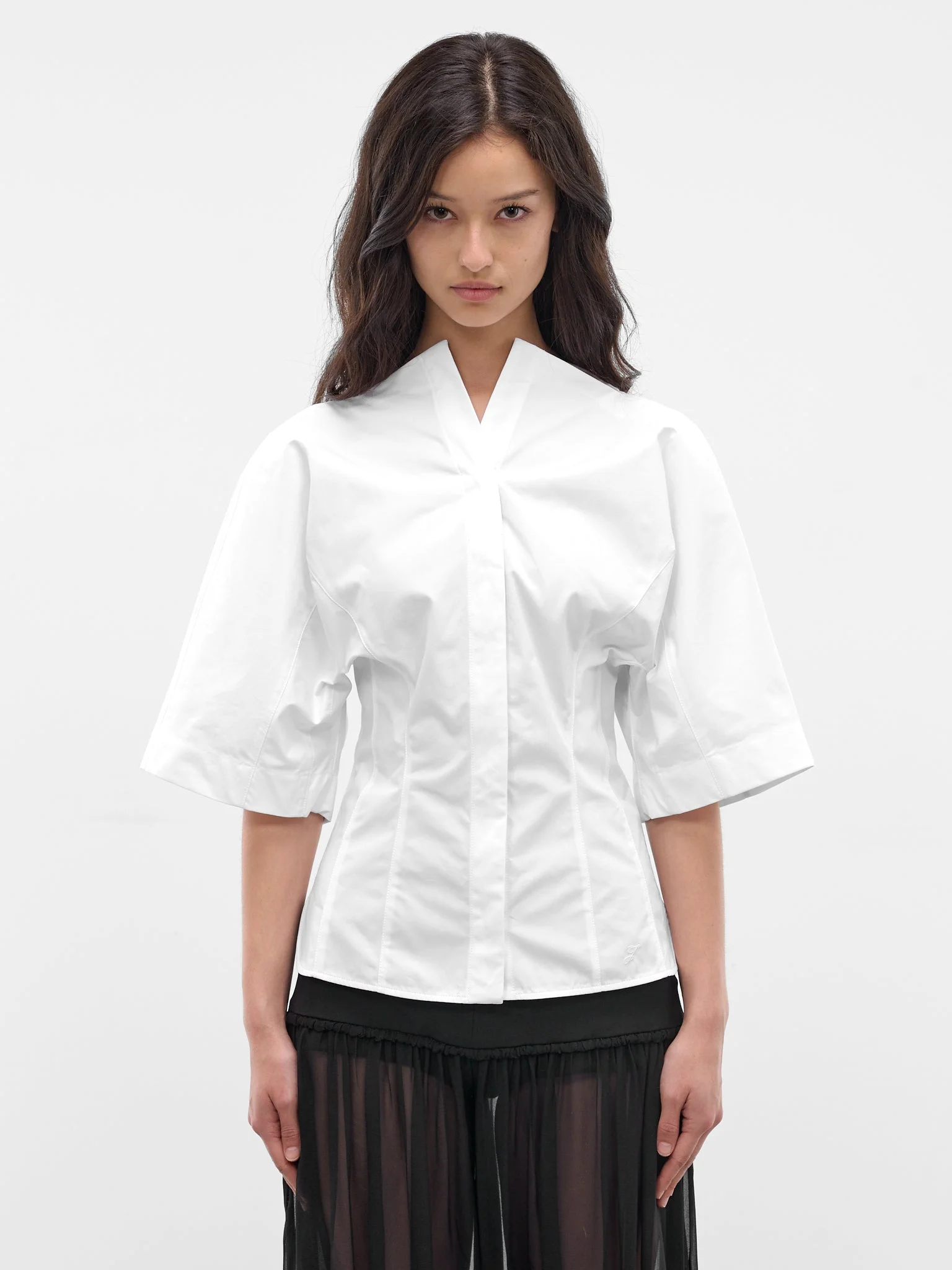 Moisson shirt in white with a compact cotton poplin construction, featuring a convertible boat neckline and clean hidden closure. Featuring: • Slim fit • Compact cotton poplin construction • Boat neck with button fastening • Hidden button placket • Wide short sleeves • Mother-of-pearl buttons • Made in Bulgaria • 100% Cotton • French sizing Model is 5'8.5" wearing size 36. Bust: 32” Waist: 24” Hips: 34”