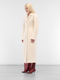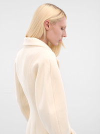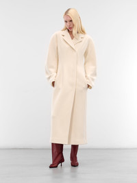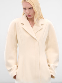Featuring: • Tailored fit and long length • Heavy bonded wool construction • Small notched lapel • Double-breasted concealed snap-button closure • Rounded long sleeves • Darted waist • Side seam pockets • Back slit • Lined • Made in Bulgaria • 100% Virgin Wool | Lining: 52% Viscose 48% Cotton • French sizing Model is 5'9" wearing size 36. Bust: 32" Waist: 25" Hips: 34"