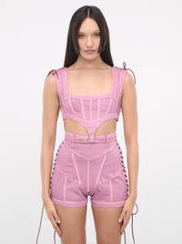JEAN PAUL GAULTIER x KNWLS pink top, laced bustier design, washed treatment, seam detailing, square neckline, snap button loop, detachable waist band, back self-tie fastening, curved hem, cropped, fitted. Made in Italy 80% Cotton, 14% Tencel, 4% Polyamide, 2% Elastane Italian Sizing Model is 5'8" wearing size 36. Bust: 32" Waist: 26" Hips: 34.5"