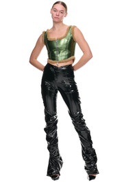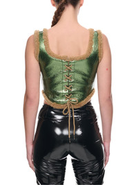 JEAN PAUL GAULTIER top in green, corset design, laminated leather, contrasting sheepskin trim, scoop neckline, sleeveless, metal zip fastening, lace-up back, form-fitting. Made in Turkey French Sizing 100% Sheepskin Model is 5'11" wearing size 34. Bust: 32” Waist: 24” Hip: 35"
