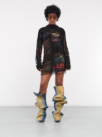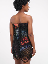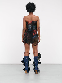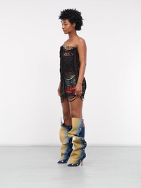 JEAN PAUL GAULTIER x SHAYNE OLIVER t-shirt dress in black, layered mixed-material construction, graphic print, overlayed cut-out paneling, straight neckline, strapless, straight hem, mini-length, slim fit. Standard Sizing Model is 5'9" wearing size S. Bust: 32" Waist: 25" Hips: 37"