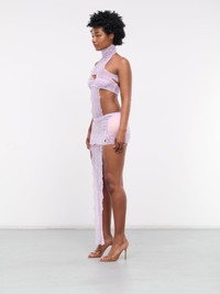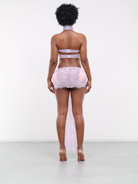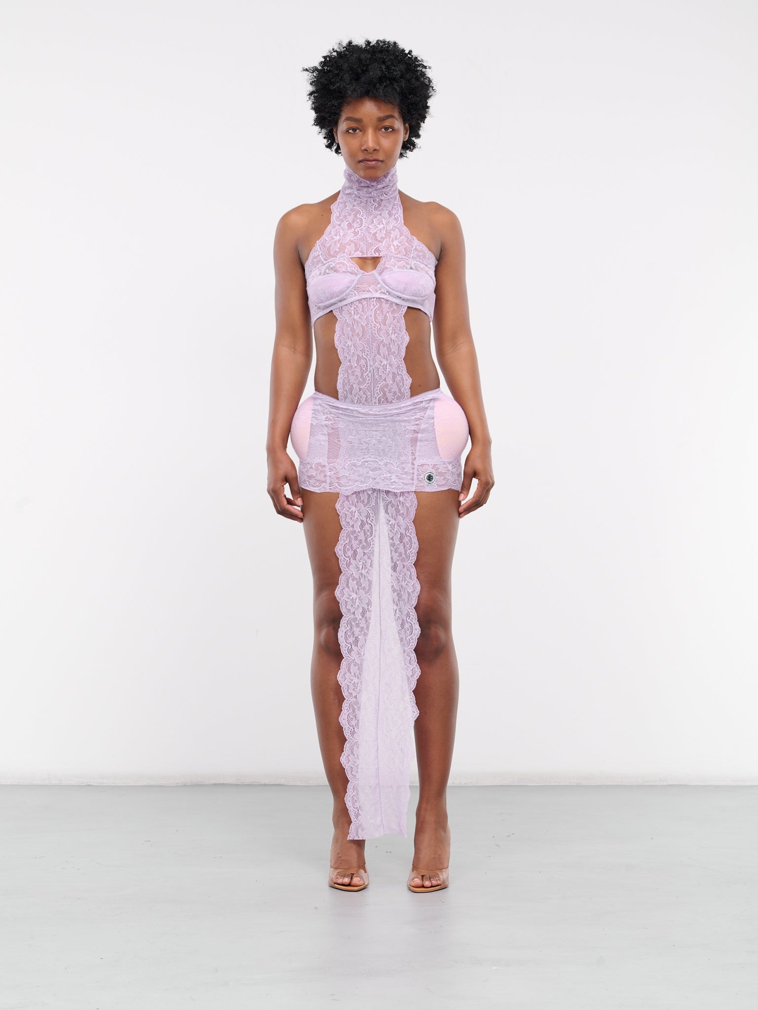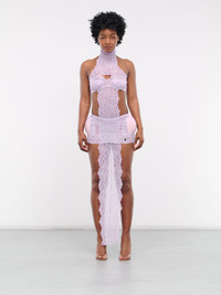 JEAN PAUL GAULTIER x SHAYNE OLIVER dress in lilac, paneled lace & mesh construction, semi-sheer, scalloped hems throughout, turtleneck, halterneck, back hook-eye fastening, sleeveless, front & side cut-outs, padded cups & underwire structuring, back hook-eye fastening, open back, hips padding, extended trim, back loop, scalloped hem, mini length, slim fit. Made in Portugal Outer: 86% Polyamide 14% Elastane Outer 2: 97% Polyester 3% Elastane Fill: 100% Polyamide Fill 2: 98% Polyamide 2% Elastane Standard Sizing Model is 5'9" wearing size XS. Bust: 32" Waist: 25" Hips: 37"
