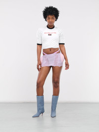 JEAN PAUL GAULTIER x SHAYNE OLIVER skirt in lilac, paneled mesh & lace construction, lace pattern, semi-sheer, low-rise, elasticated waist, hip cut-outs, hip padding, back loop, scalloped hem, mini-length, slim fit. Made in France Outer 1: 86% Polyamide 14% Elastane Outer 2: 100% Polyester Standard Sizing Model is 5'9" wearing size XS. Bust: 32" Waist: 25" Hips: 37"