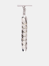 This silver bracelet is crafted from brass to resemble a series of layered spoons. This trompe l'oeil design is finished with linked chains, a toggle fastening, and a subtle logo engraving. A statement bracelet that embodies illusion and allure. Featuring: • Silver-tone hardware • Trompe l'oeil cutlery design • Layered spoon heads • Chain links and toggle fastening • Subtle logo engraving • Made in Italy • 100% Brass • One Size