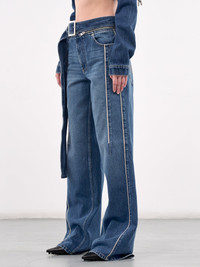 JEAN PAUL GAULTIER jeans in blue, paneled denim construction, high waist, belt loop & adjustable pin-buckle belt, detachable zip detailing, front button & concealed zip fly closure, inset pockets, coin pocket, back patch pockets, back logo patch, side contrast seams, wide leg, loose fit. Made in Italy 100% Cotton Standard Sizing Model is 5'7" wearing size 25. Bust: 30" Waist: 24" Hips: 35"