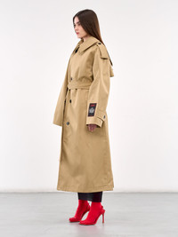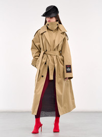 JEAN PAUL GAULTIER coat in beige, trenchcoat design, poly-cotton blend, paneled construction, deconstructed detailing, layered collars, shoulder epaulets, storm flap, long sleeves, cuff logo patch, front button closure, waist self-tie fastening, side welt pockets, back vent, straight hem, lined, maxi-length, oversized fit. Made in Italy Outer: 65% Polyester 35% Cotton Sleeve Lining: 100% Viscose Body Lining: 100% Cotton French Sizing Model is 5'7" wearing size 34. Bust: 30" Waist: 24" Hips: 35"