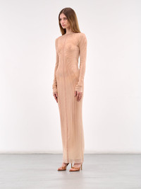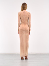 JEAN PAUL GAULTIER dress in pink, paneled nylon construction, "Spirale" graphic print, crewneck, back loop, long sleeves, straight hem, tulle lining, maxi-length, slim fit. Made in Italy 100% Polyamide Standard Sizing Model is 5'9" wearing size XS. Bust: 32" Waist: 23" Hips: 34"