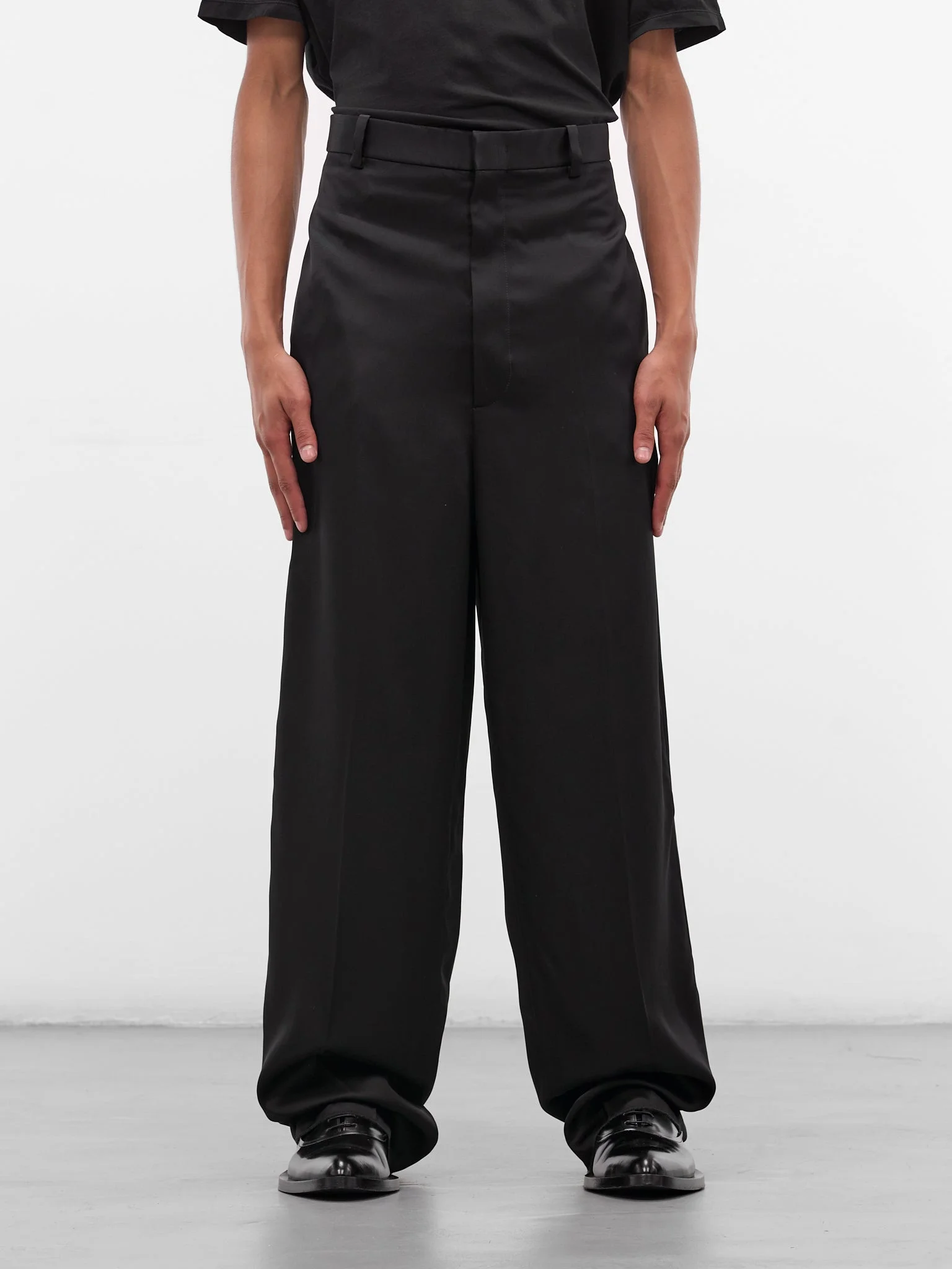 Tailored trousers crafted from double splittable wool gabardine in black. The structured fabric and straight-leg silhouette create a refined balance of precision and ease. Featuring: • Straight fit and leg • Slightly low crotch and high waist • Zip fly and hook closure • Belt loops • Side-seam pockets • Back welt pockets • Viscose half-lining and cotton pocket lining • Made in Italy • 99% Virgin Wool 1% Silk • Italian sizing Model is 5'11.5" wearing size 48. Shoulders: 18" Chest: 36" Waist: 30"
