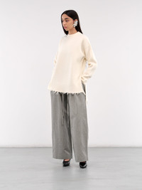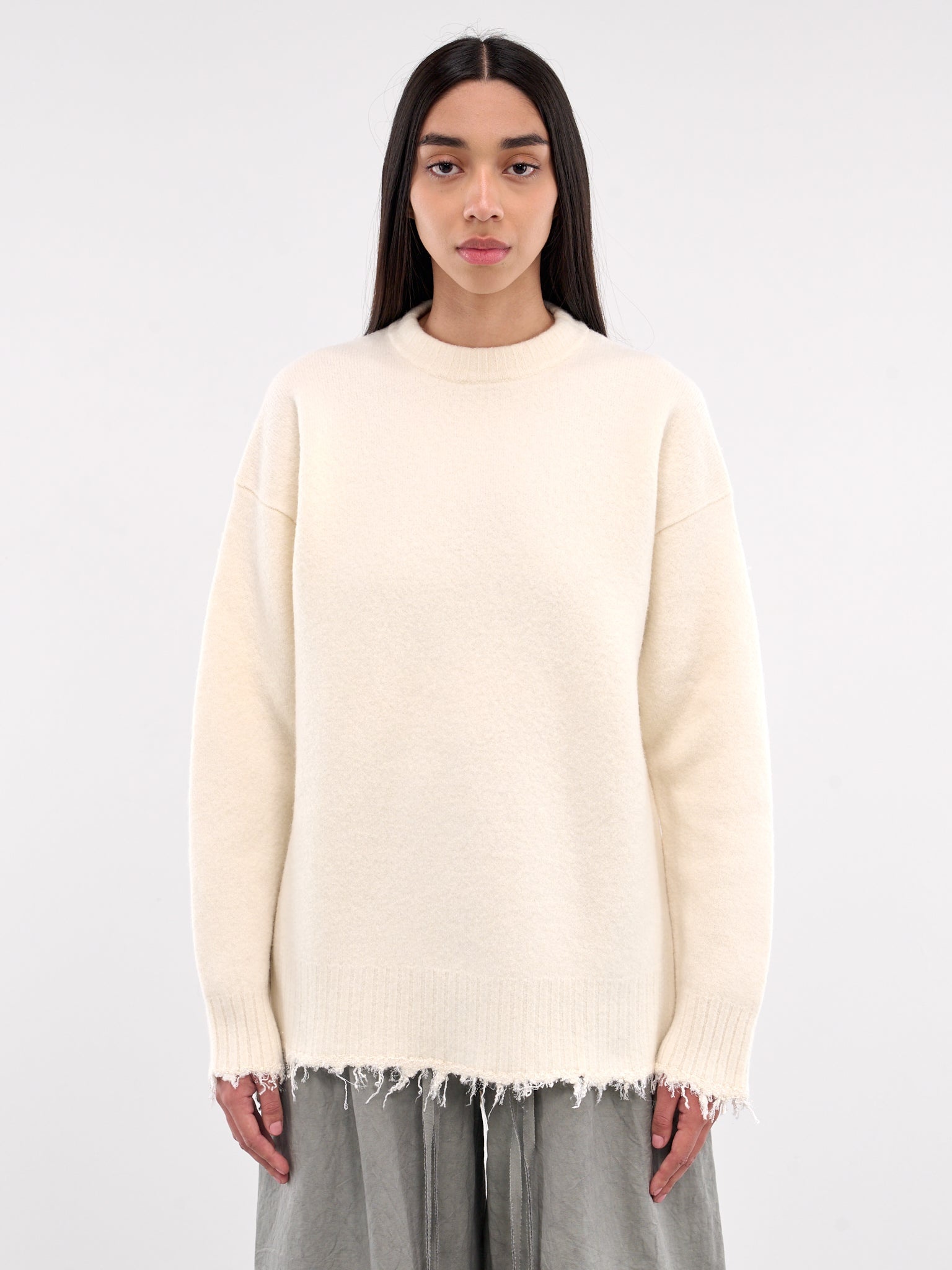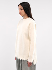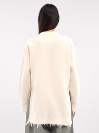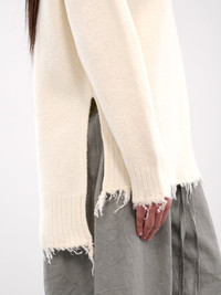 JIL SANDER sweater in coconut, paneled knit construction, ribbed crewneck, long sleeves, rib-knit cuffs & hem, frayed hems, straight hem, relaxed fit. Made in Italy Standard Sizing Model is 5'7" wearing size S. Bust: 32.5" Waist: 24" Hips: 32"