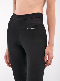 JIL SANDER leggings in black, paneled construction, high waist, fitted waistband, logo detailing, skinny leg, form fit. Made in Italy Standard Sizing Model is 5'9" wearing size S. Bust: 32" Waist: 23" Hips: 34"