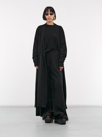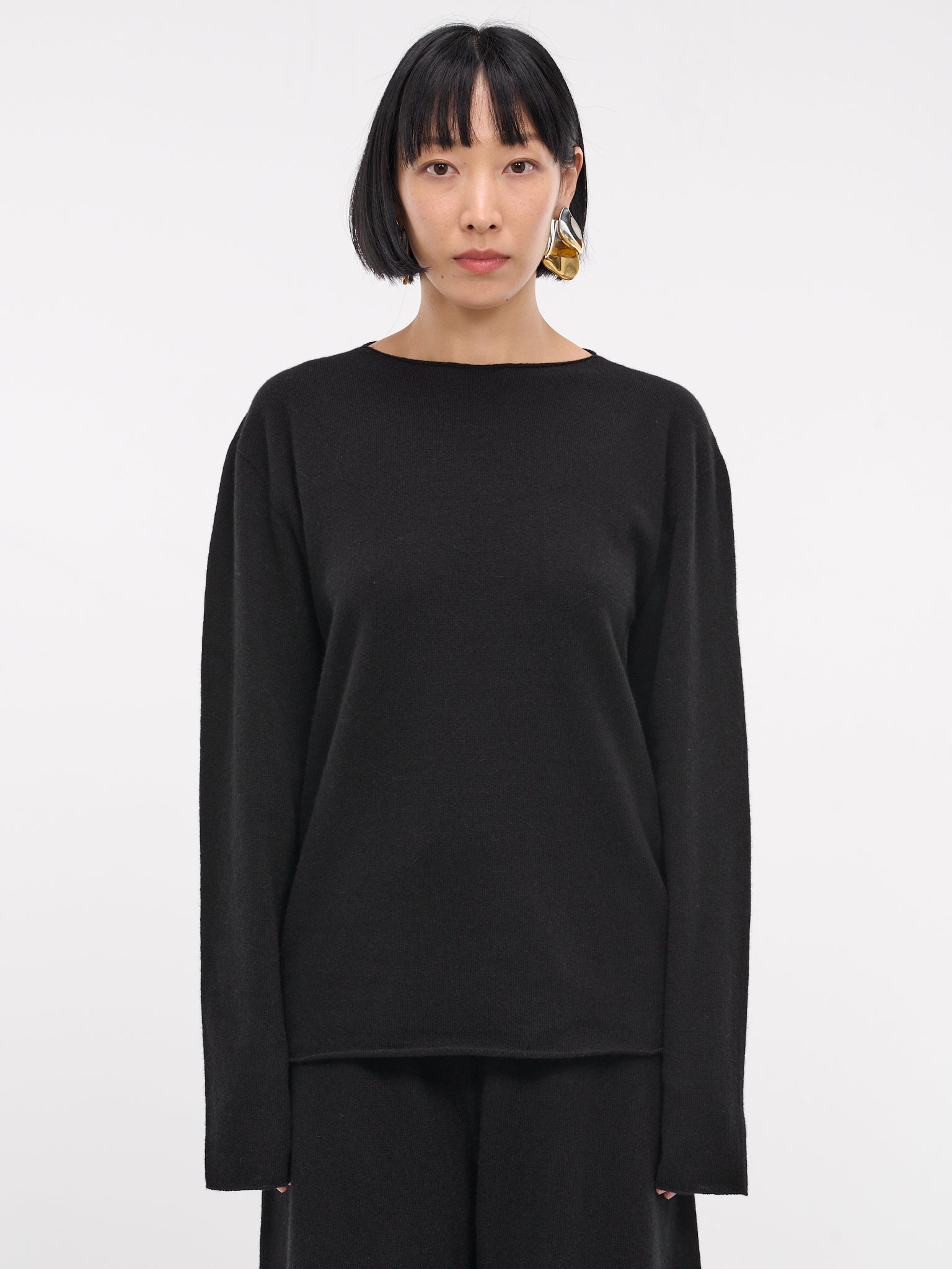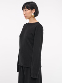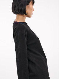 JIL SANDER sweater in black, paneled knit construction, wide neck, long sleeves, raw hems, straight hem, relaxed fit. Made in Italy French Sizing Model is 5'9" wearing size 36. Bust: 30" Waist: 23" Hips: 35"