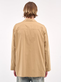 JIL SANDER shirt in beige, paneled cotton construction, camp collar, front button placket closure, long sleeves, button cuffs, chest flap pockets, side logo embroidery, straight hem, oversized fit. 100% Cotton Italian Sizing Model is 6'1.5" wearing size 48. Shoulders: 18.5" Chest: 37" Waist: 31"