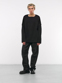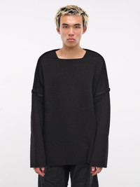 JIL SANDER sweater in black, paneled knit construction, rib-knit, exposed seams, squared neck, dropped shoulders, long sleeves, straight hem, relaxed fit. Made in Italy Standard Sizing Model is 5'11" wearing size M. Shoulders: 18" Chest: 36" Waist: 27"