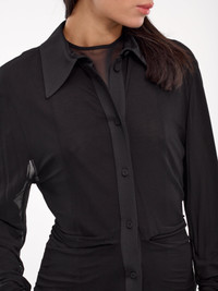 JIL SANDER shirt in black, paneled construction, sheer, spread collar, front buttoned placket closure, long sleeves, buttoned cuffs, curved hem, slim fit. Made in Italy French Sizing Model is 5'6" wearing size 36. Bust: 31" Waist: 24" Hips: 34"