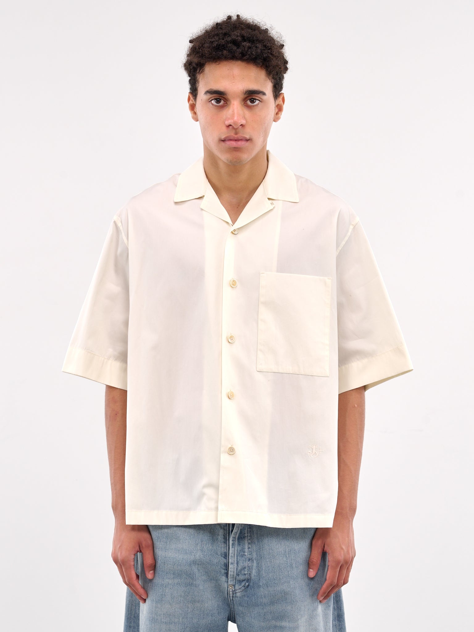 Cut from crisp off-white cotton poplin, this camp-collar shirt pairs Jil Sander’s clean lines with a boxy, modern silhouette. Subtle logo embroidery at the side seam finishes the signature minimalist look. Featuring: • Boxy fit • Paneled cotton poplin construction • Camp collar with front button placket closure • Short sleeves and chest patch pocket • Straight hem with side logo embroidery • Made in Italy • 100% Cotton • Italian sizing Model is 6'1" wearing size 48. Shoulders: 19" Chest: 38" Waist: 28"